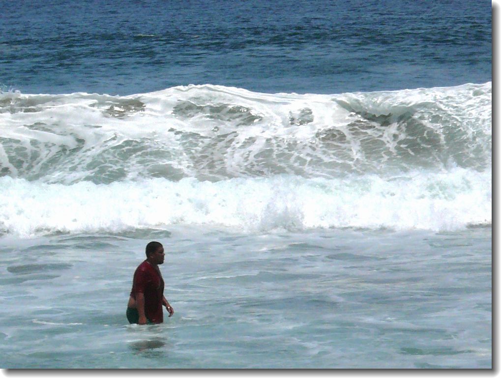浜辺では泳いだり、さらにだらだらしたり・・・泳ぐといっても波がすごく高いんです(^^;;写真ではイマイチ伝わらないかもしれないのですが、高いときだと海面から2メートル以上波がせり上がります。その分引く力も非常に強く、腰の下までつかるくらいの水深の場所ではまともに立っていられない程です。一度だけ足の着かない所まで行ったのですが、一瞬どうにも戻れなくなり、命の危険を感じました(^^;;