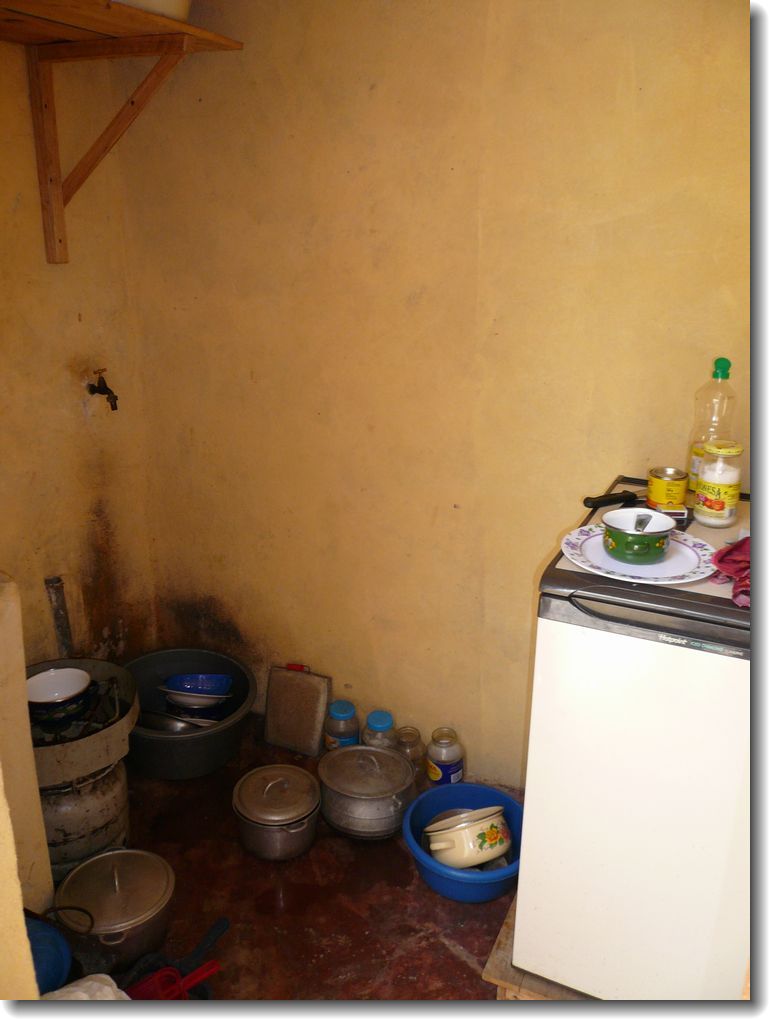 一応ガスコンロ的なものと冷蔵庫があります。冷蔵庫の中身はほとんど水で す。料理をするときは、材料をその日買ってきてそのまま作るので、食料の保 存はあまりしないのでしょう。