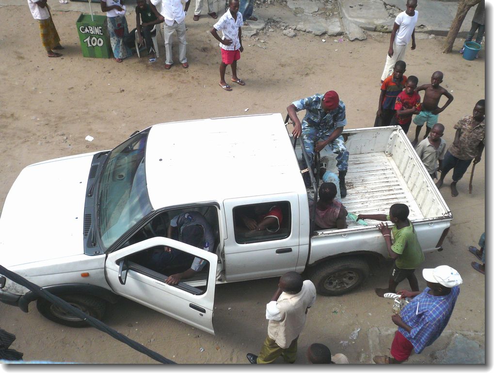 彼は間も無く到着した警官に連行されていきました。悪いことはできませんね。荷台に乗っているのが犯人で、頭にひどい裂傷があるのが離れたところからでも見えます。